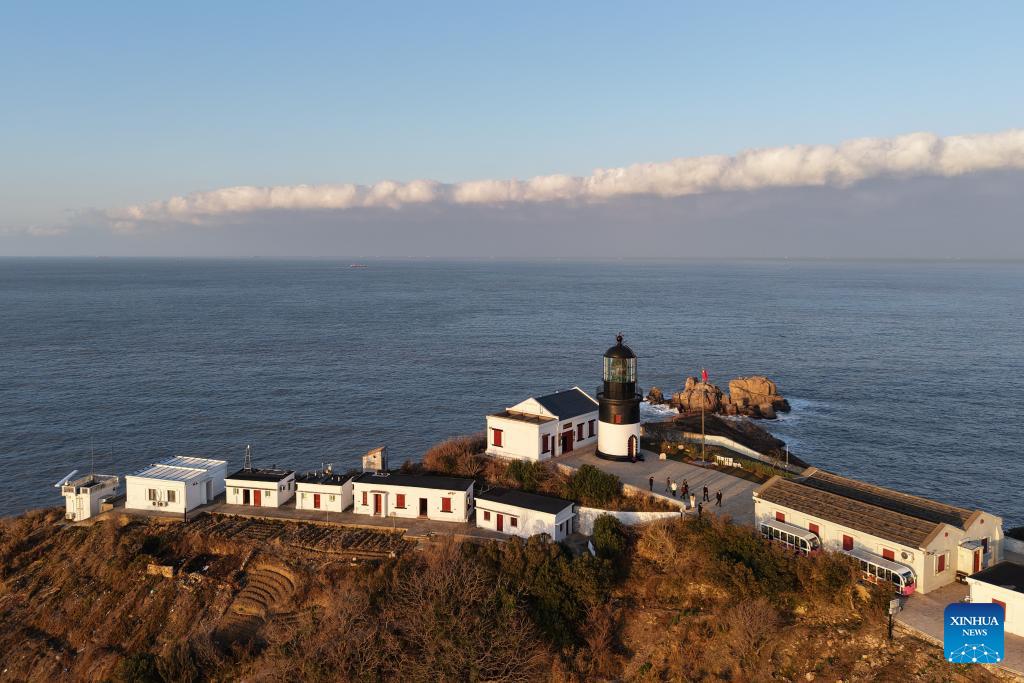 This photo taken on Jan. 29, 2026 shows the Huaniao lighthouse in Huaniao Town of Shengsi County in Zhoushan City, east China's Zhejiang Province. The Huaniao lighthouse, built in 1870, is located at the northernmost point of the Zhoushan archipelago on the shipping route from the Yangtze River estuary to the Pacific Ocean. (Xinhua/Huang Zongzhi)