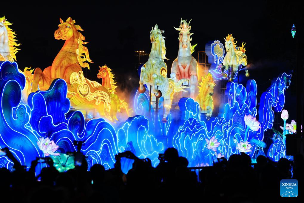This photo taken on Jan. 30, 2026 shows a set of lanterns inspired by the Chinese zodiac horse during the 2026 Guangzhou Spring Festival lantern show in Guangzhou, south China's Guangdong Province. The event kicked off at the Yuexiu Park in Guangzhou on Friday, featuring 85 groups of distinctive lantern displays scattered throughout the ten major tourist areas of the entire park, and will last until March, 8. (Xinhua/Wang Ruiping)