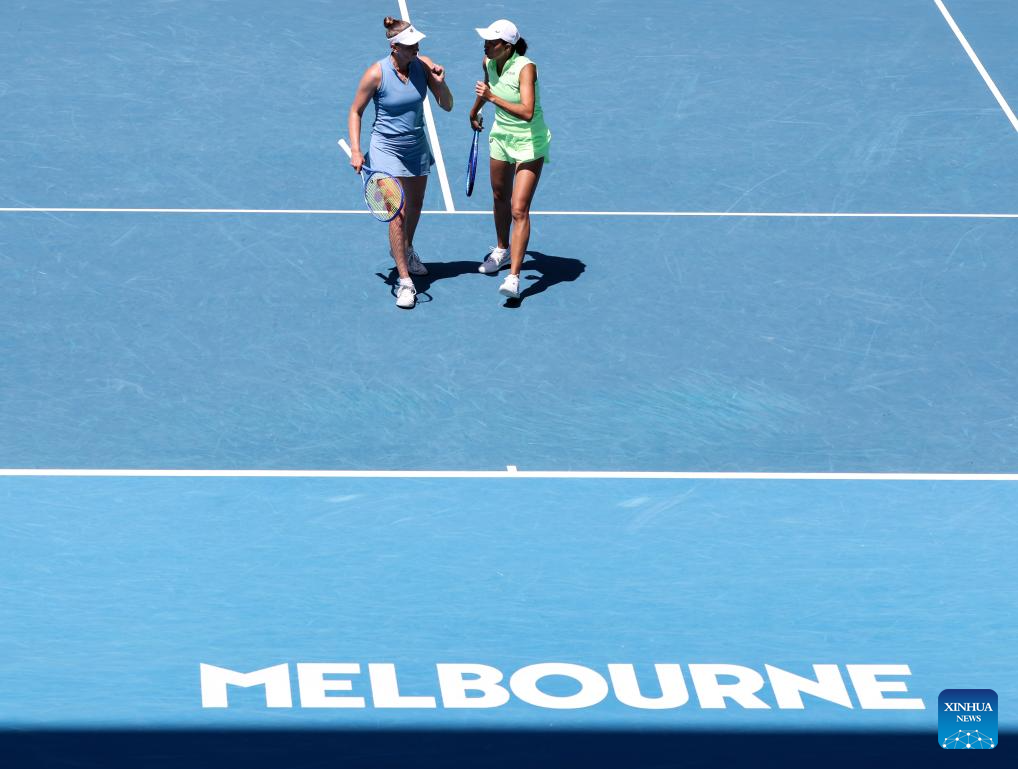Zhang Shuai (R)/Elise Mertens discuss during the women's doubles final match between Zhang Shuai (China)/Elise Mertens (Belgium) and Anna Danilina (Kazakhstan)/Aleksandra Krunic (Serbia) at the Australian Open tennis tournament in Melbourne, Australia, Jan. 31, 2026. (Xinhua/Ma Ping)