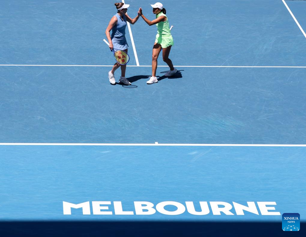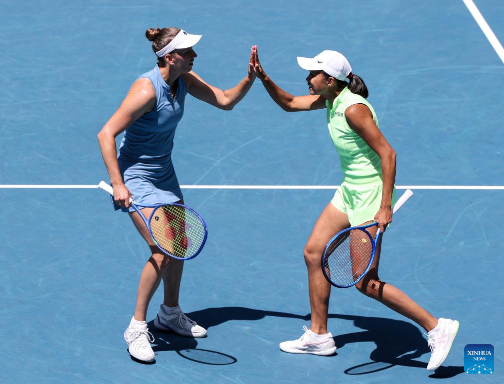 Zhang Shuai (R)/Elise Mertens celebrate scoring during the women's doubles final match between Zhang Shuai (China)/Elise Mertens (Belgium) and Anna Danilina (Kazakhstan)/Aleksandra Krunic (Serbia) at the Australian Open tennis tournament in Melbourne, Australia, Jan. 31, 2026. (Xinhua/Ma Ping)