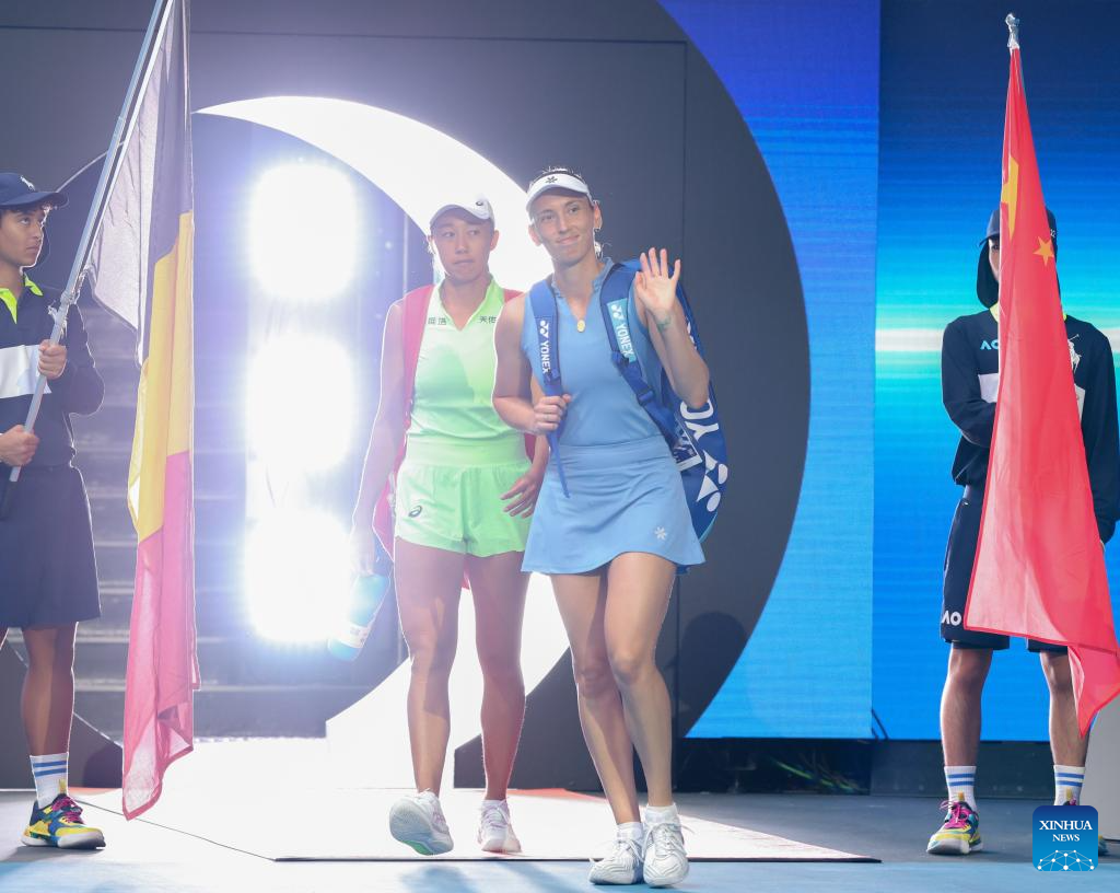 Zhang Shuai (2nd L)/Elise Mertens (2nd R) enter the court before the women's doubles final match between Zhang Shuai (China)/Elise Mertens (Belgium) and Anna Danilina (Kazakhstan)/Aleksandra Krunic (Serbia) at the Australian Open tennis tournament in Melbourne, Australia, Jan. 31, 2026. (Xinhua/Ma Ping)