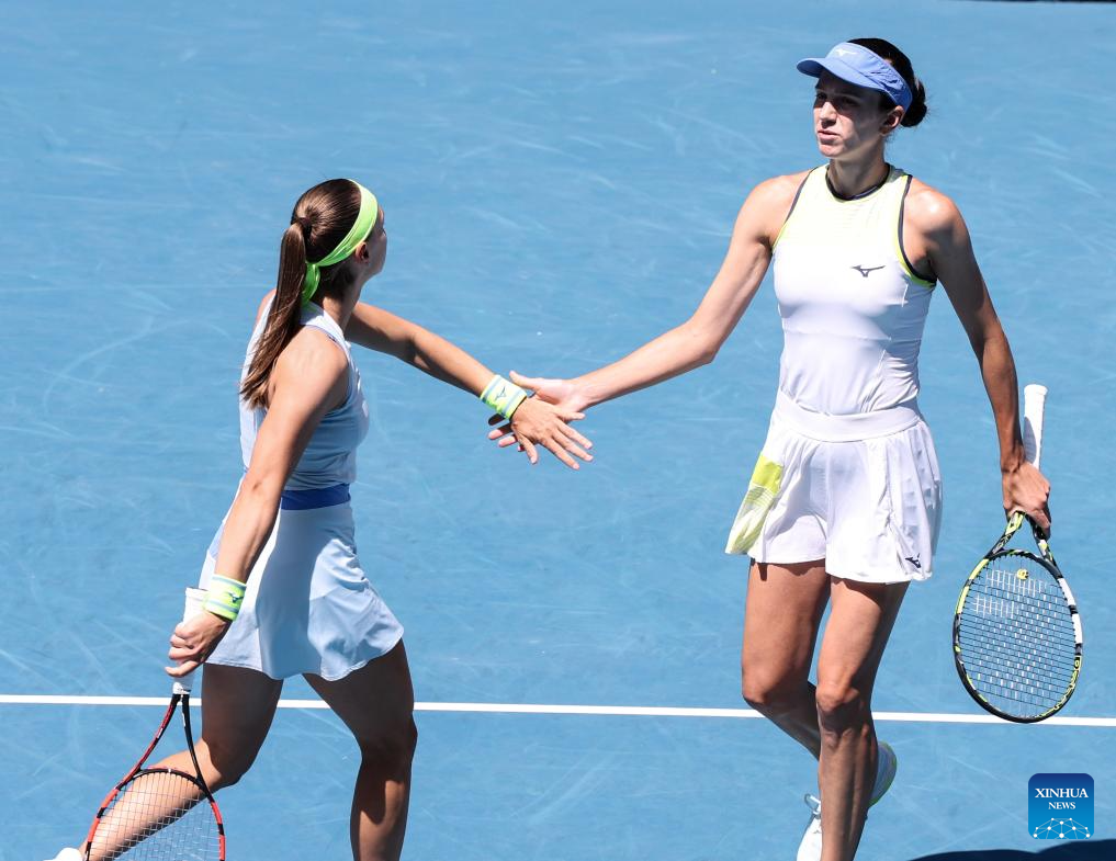 Anna Danilina (R)/Aleksandra Krunic celebrate scoring during the women's doubles final match between Zhang Shuai (China)/Elise Mertens (Belgium) and Anna Danilina (Kazakhstan)/Aleksandra Krunic (Serbia) at the Australian Open tennis tournament in Melbourne, Australia, Jan. 31, 2026. (Xinhua/Ma Ping)