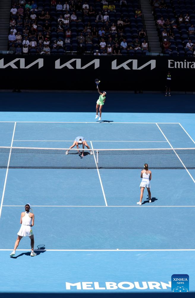 Zhang Shuai (top R)/Elise Mertens (top L) compete during the women's doubles final match between Zhang Shuai (China)/Elise Mertens (Belgium) and Anna Danilina (Kazakhstan)/Aleksandra Krunic (Serbia) at the Australian Open tennis tournament in Melbourne, Australia, Jan. 31, 2026. (Xinhua/Ma Ping)