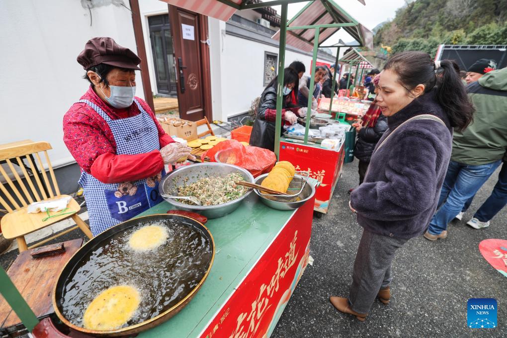 A vendor makes local foods at a festive market in Lianhua Township, east China's Zhejiang Province, Feb. 1, 2026. A Spring Festival cultural event was held here with great enthusiasm on Sunday. Local residents and tourists enjoyed the festive market, viewed the local art exhibition, participated in traditional games, and savored local foods. (Xinhua/Xu Yu)