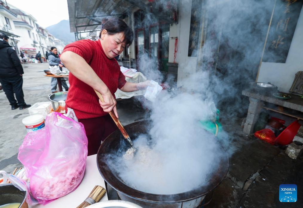 A local resident makes local foods in Lianhua Township, east China's Zhejiang Province, Feb. 1, 2026. A Spring Festival cultural event was held here with great enthusiasm on Sunday. Local residents and tourists enjoyed the festive market, viewed the local art exhibition, participated in traditional games, and savored local foods. (Xinhua/Xu Yu)