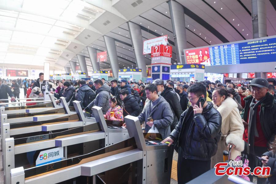 Passengers enter Beijing South Railway Station to board trains on Feb. 1, as China’s 2026 Spring Festival travel rush approaches. The 40-day travel period is expected to set a new historical high in passenger flows. (Photo: China News Service/Jia Tianyong)