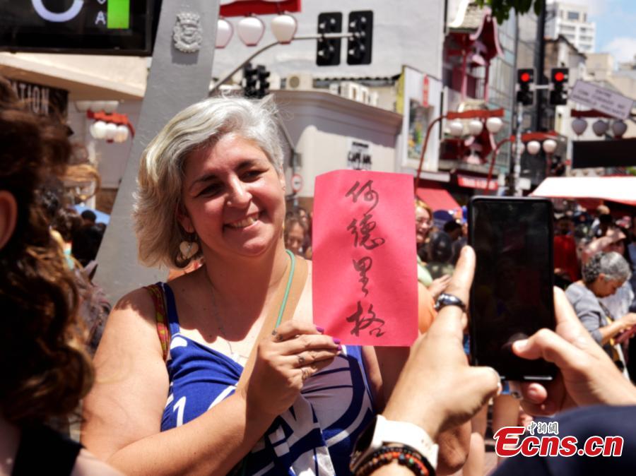 A Brazilian visitor displays a Chinese calligraphy work featuring his Chinese name at a Chinese New Year fair at Liberdade Square in Sao Paulo, Brazil, Jan. 31. (Photo: China News Service/Wang Wei)