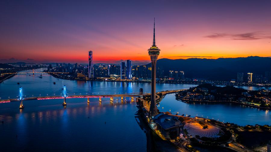 An aerial drone photo taken on July 5, 2024 shows a night view of the Macao Tower (front) in Macao and Zhuhai of Guangdong in south China. (Photo: Xinhua)