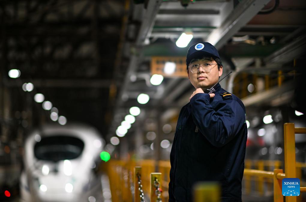 Li Qiwei communicates with his colleagues via walkie-talkie at an electric multiple unit (EMU) maintenance depot in north China's Tianjin Municipality, on Feb. 1, 2026. Several EMU trains are neatly lined up for "health checkups" inside a maintenance depot in Tianjin at the night of Feb. 1, right before the start of Spring Festival travel rush, the annual homeward journey in China, and also the world's largest human migration.