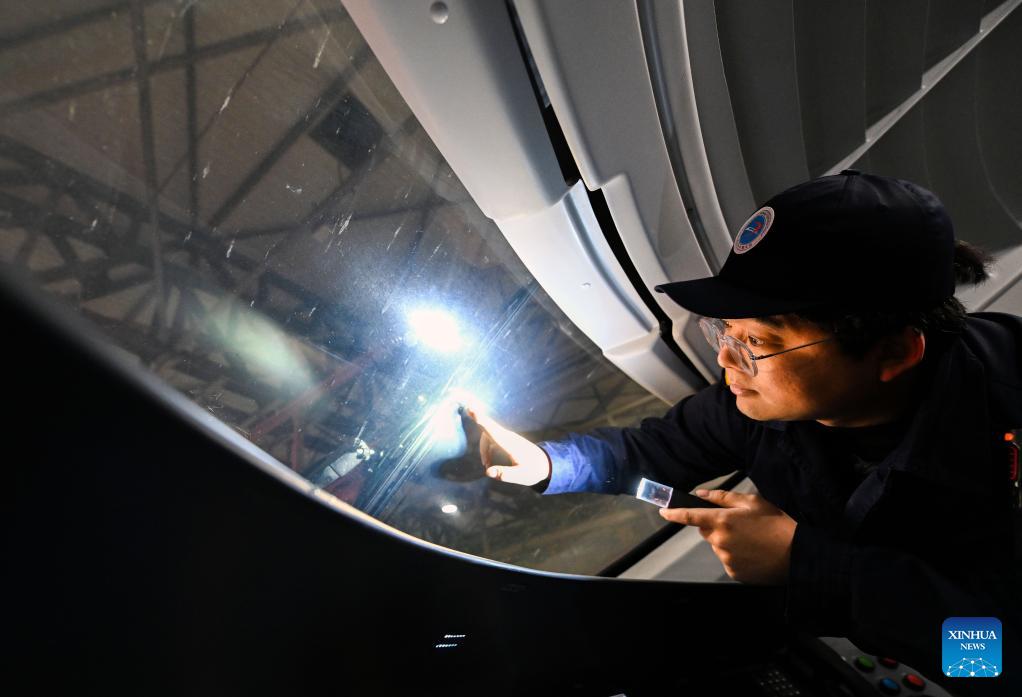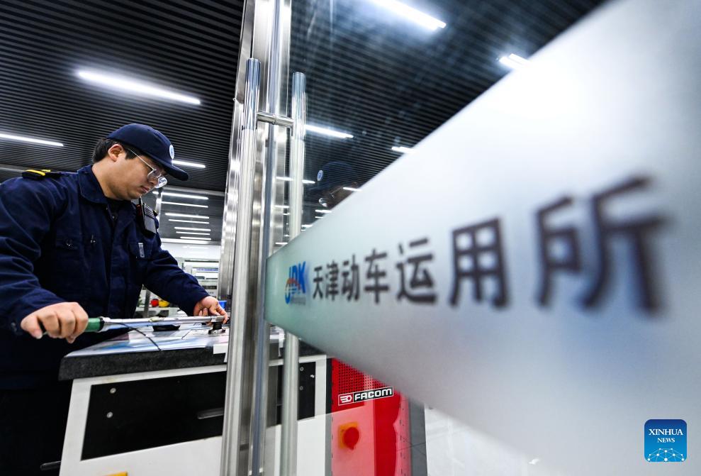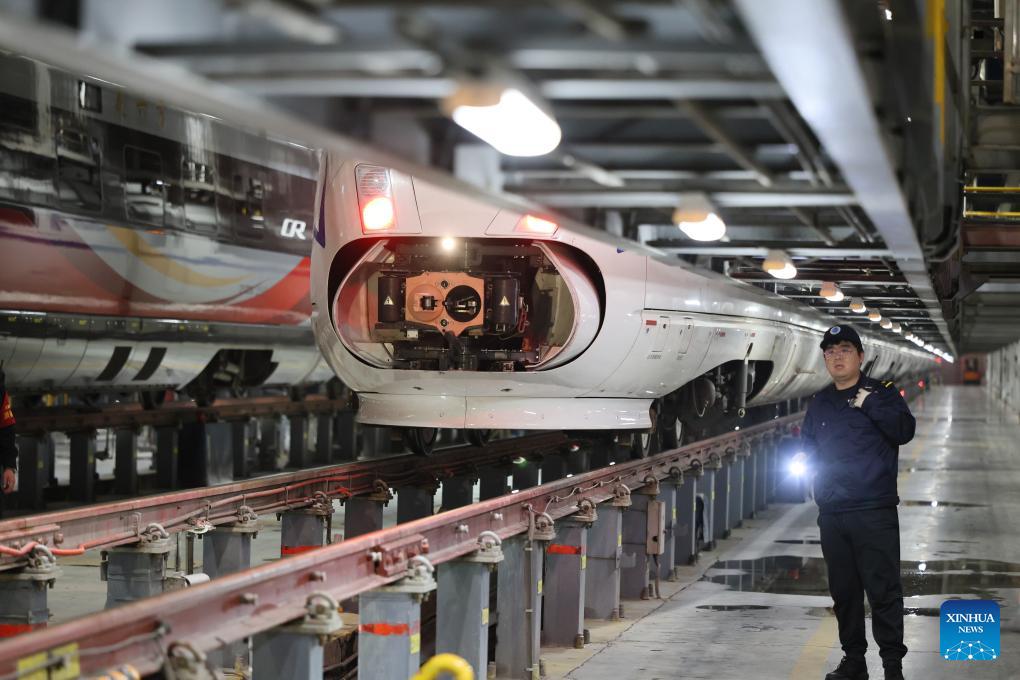 Li Qiwei works at an electric multiple unit (EMU) maintenance depot in north China's Tianjin Municipality, on Feb. 1, 2026. Several EMU trains are neatly lined up for "health checkups" inside a maintenance depot in Tianjin at the night of Feb. 1, right before the start of Spring Festival travel rush, the annual homeward journey in China, and also the world's largest human migration.