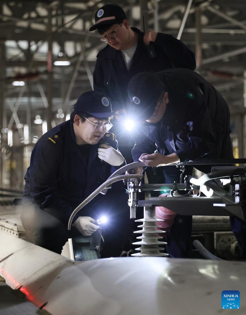 Li Qiwei (L) works with his colleagues at an electric multiple unit (EMU) maintenance depot in north China's Tianjin Municipality, on Feb. 2, 2026. Several EMU trains are neatly lined up for "health checkups" inside a maintenance depot in Tianjin at the night of Feb. 1, right before the start of Spring Festival travel rush, the annual homeward journey in China, and also the world's largest human migration.
