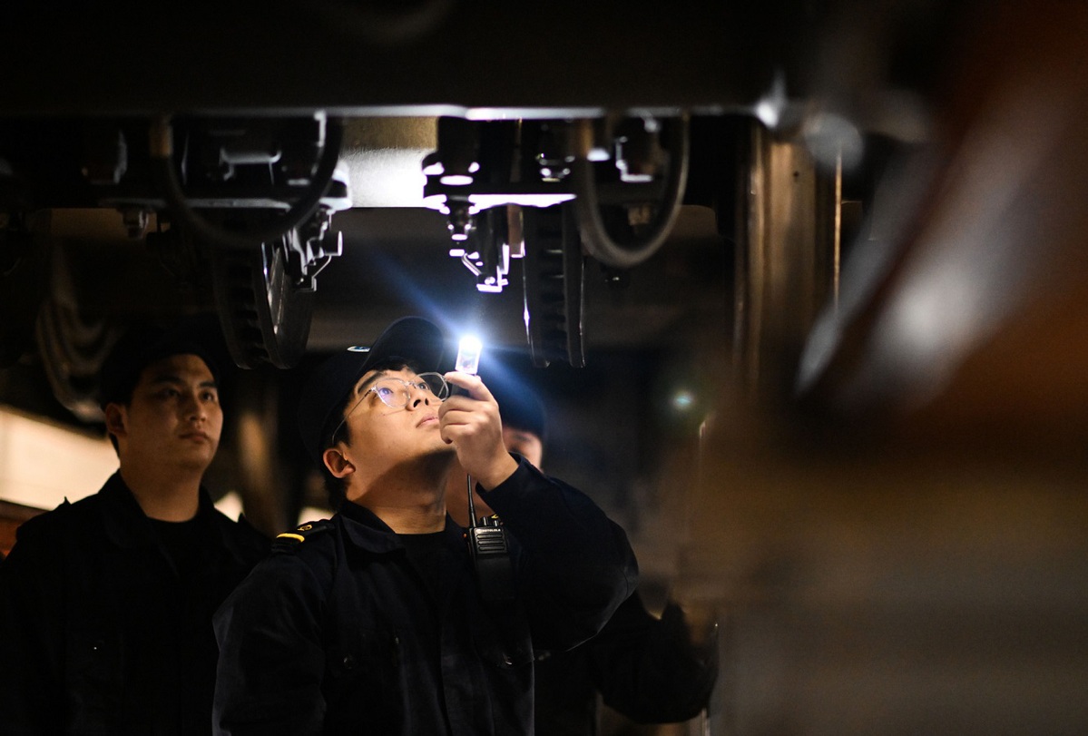 To ensure safe and punctual departure of these trains, Li Qiwei, the leader of a maintenance team, had to work overnight with more than 40 mates on his team to perform full-body examination for 28 sets of EMUs — a workload about 20 percent higher than that of a normal workday.