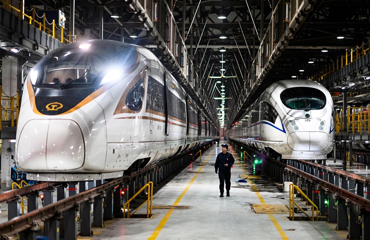 Several EMU trains are neatly lined up for "health checkups" inside a maintenance depot in Tianjin at the night of Feb 1, right before the start of Spring Festival travel rush, the annual homeward journey in China, and also the world's largest human migration.