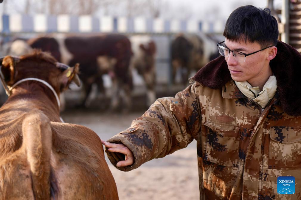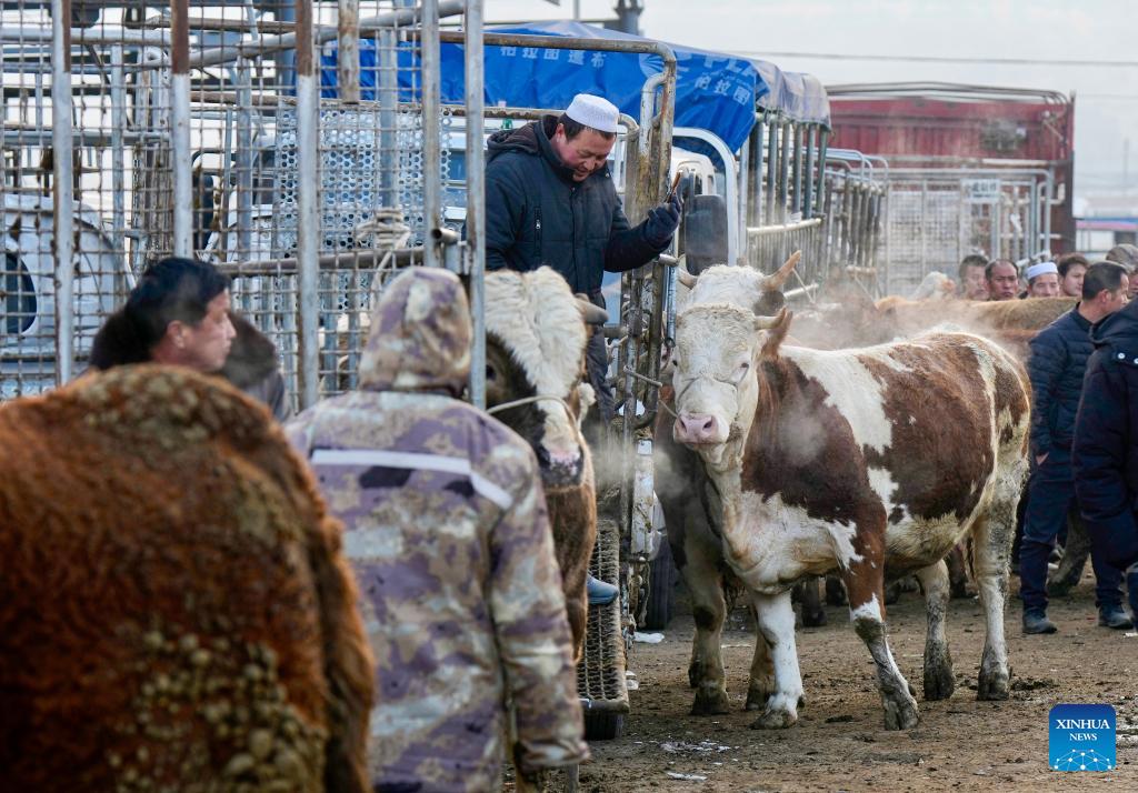 A local broker purchases cattle at Shanjiaji livestock trading market in Xiji County, northwest China's Ningxia Hui Autonomous Region, Feb. 4, 2026. Wednesday marks "Lichun," or the Beginning of Spring, the first of the 24 solar terms on the Chinese lunisolar calendar. It's also a trading day for Shanjiaji livestock trading market. In recent years, the market has become one of the largest village-level livestock trading markets in the area, currently trading over 250,000 heads of beef cattle annually. (Xinhua/Yang Zhisen)