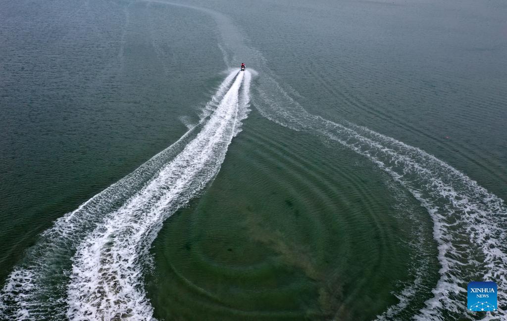 An aerial drone photo taken on Feb. 5, 2026 shows tourists enjoying water activities in the sea near Beihai City, south China's Guangxi Zhuang Autonomous Region. (Xinhua/Lu Boan)