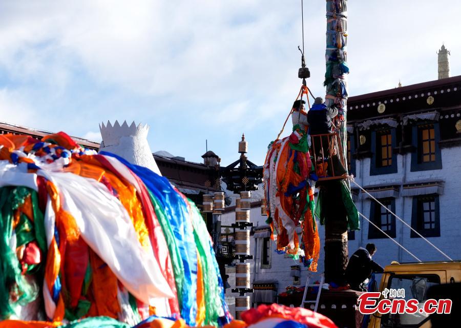 Prayer flag poles at Jokhang Temple renewed for Tibetan New Year