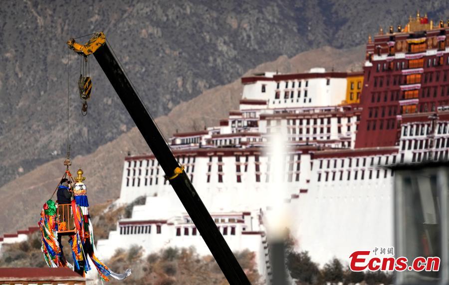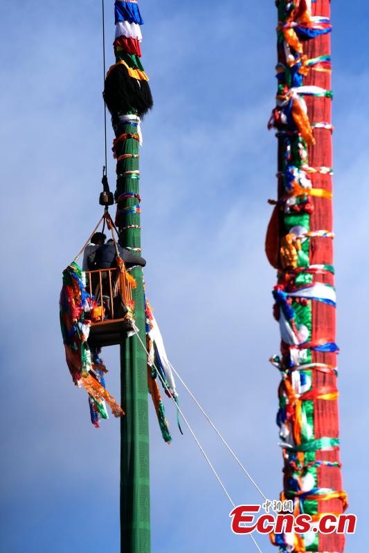 On Feb. 5, 2026, staff at the Jokhang Temple in Lhasa, capital of southwest China's Xizang Autonomous Region, replace prayer flags on five poles, each more than 20 meters high, around the temple as part of a traditional ritual to welcome the upcoming Tibetan New Year. (Photo: China News Service/Li Lin)