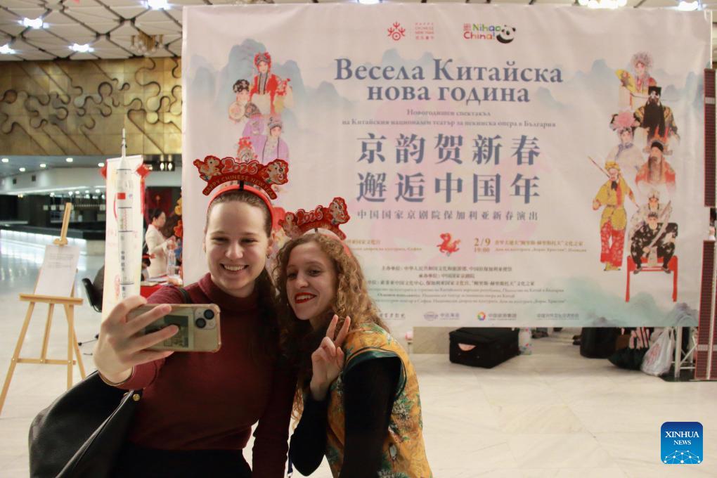 Bulgarians take selfies in front of the poster of the China National Peking Opera Company's performance at the National Palace of Culture in Sofia, Bulgaria, Feb. 6, 2026. The China National Peking Opera Company launched its "Happy Chinese New Year" tour with a landmark performance in Sofia on Friday, dazzling Bulgarian audiences and strengthening Sino-Bulgarian friendship. (Photo: Marian Draganov/Xinhua)