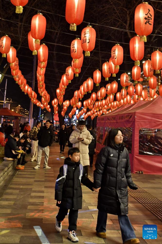 People walk under lanterns hung to celebrate Spring Festival in Beijing, capital of China, Feb. 7, 2026. (Xinhua/Li Xin)