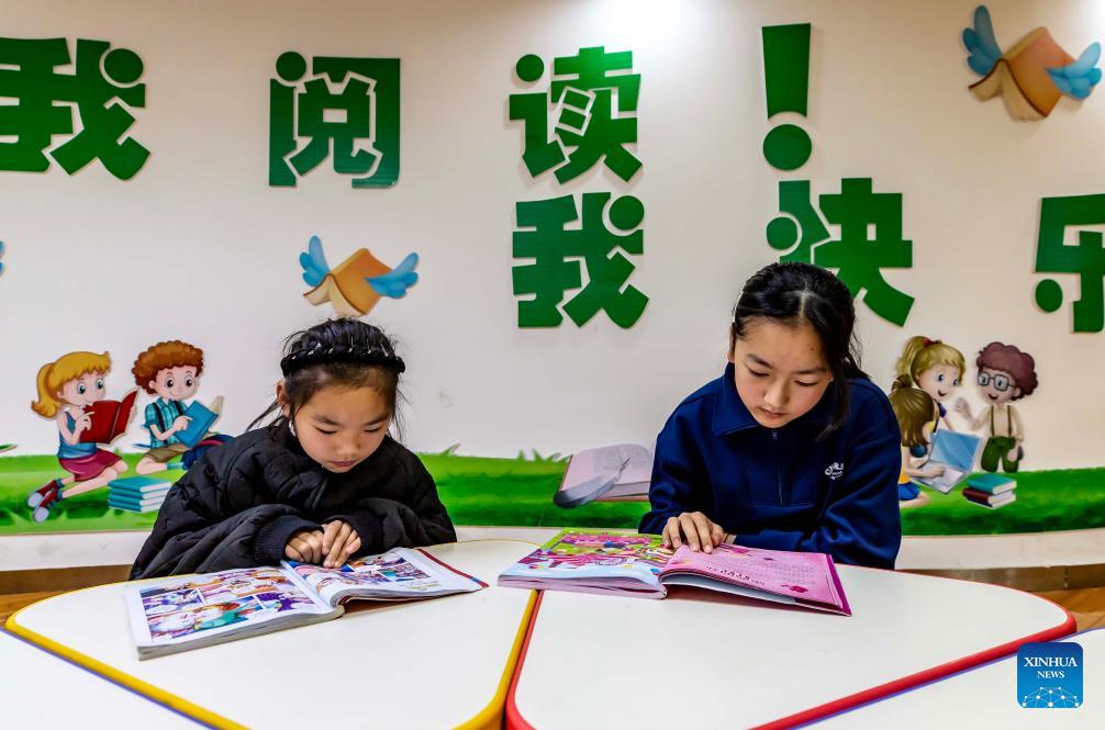 Children read books at a library in Qianxi, southwest China's Guizhou Province, on Feb. 8, 2026. Various extracurricular activities are available for students across China during the winter vacation. (Photo by Fan Hui/Xinhua)