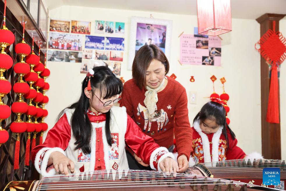 Children practice playing guzheng at a music store under the guidance of an instructor in Deqing County of Huzhou, east China's Zhejiang Province, on Feb. 8, 2026. Various extracurricular activities are available for students across China during the winter vacation. (Photo by Ni Lifang/Xinhua)