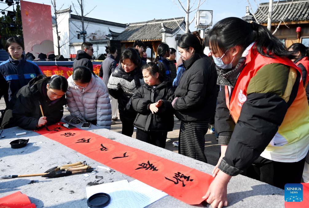 Students write spring couplets for charity sale in Wuyi County of Jinhua, east China's Zhejiang Province, on Feb. 8, 2026. Various extracurricular activities are available for students across China during the winter vacation. (Photo by Zhang Jiancheng/Xinhua)