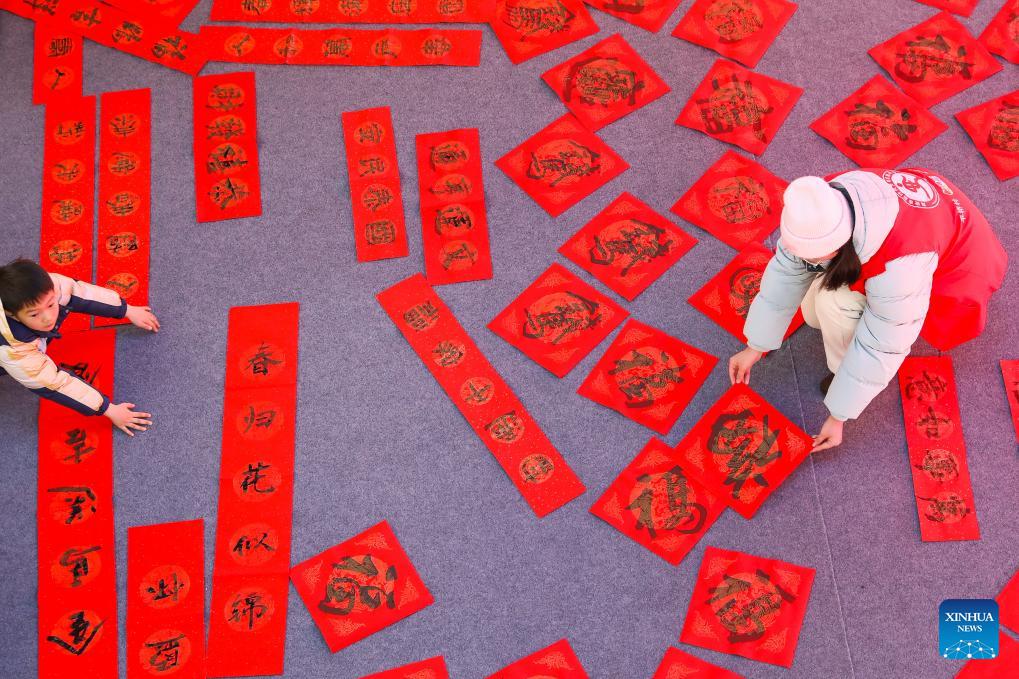Students write spring couplets at a primary school in Dongyang, east China's Zhejiang Province, on Feb. 8, 2026. Various extracurricular activities are available for students across China during the winter vacation. (Photo by Bao Kangxuan/Xinhua)