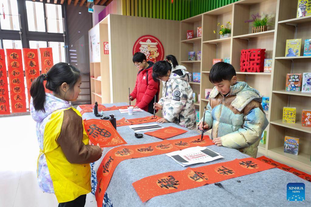 Students write spring couplets in an event celebrating the upcoming Spring Festival at a bookstore in Xinghua City, east China's Jiangsu Province, on Feb. 7, 2026. Various extracurricular activities are available for students across China during the winter vacation. (Photo by Zhou Shegen/Xinhua)
