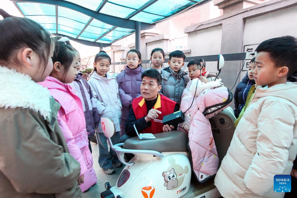 A power supply worker explains electricity usage knowledge to students at a primary school in Bo'ai County of Jiaozuo, central China's Henan Province, on Feb. 5, 2026. Various extracurricular activities are available for students across China during the winter vacation. (Photo by Cheng Quan/Xinhua)