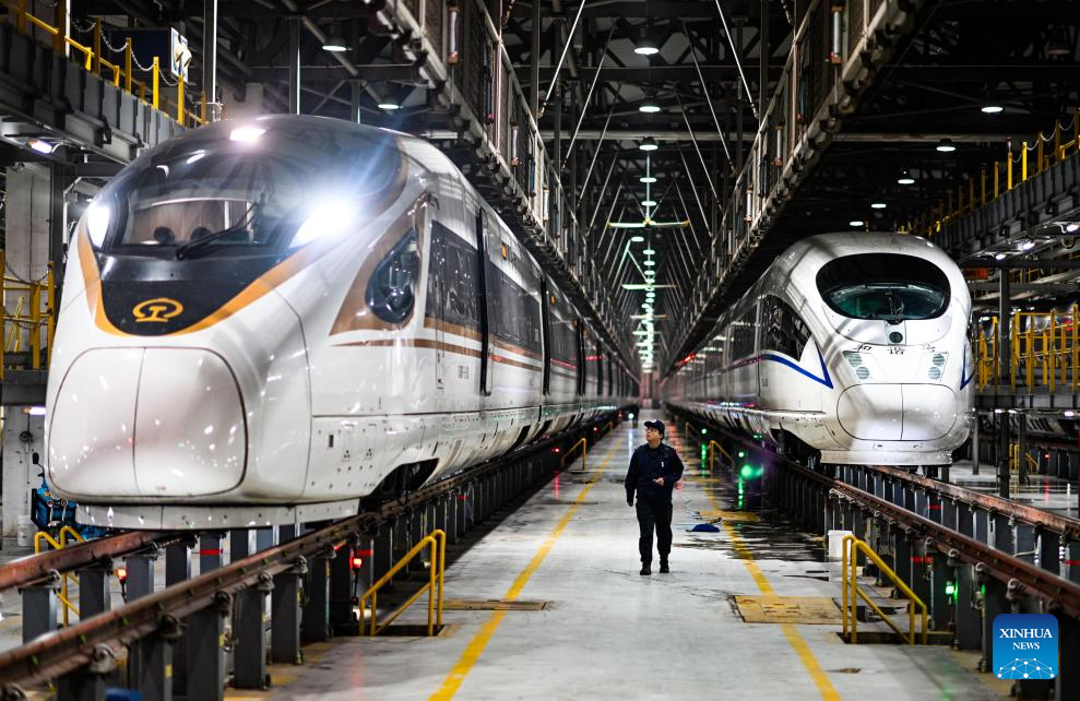 Li Qiwei works at an electric multiple unit (EMU) maintenance depot in north China's Tianjin Municipality, on Feb. 1, 2026. Several EMU trains are neatly lined up for "health checkups" inside a maintenance depot in Tianjin at the night of Feb. 1, right before the start of Spring Festival travel rush, the annual homeward journey in China, and also the world's largest human migration. (Photo: Xinhua)