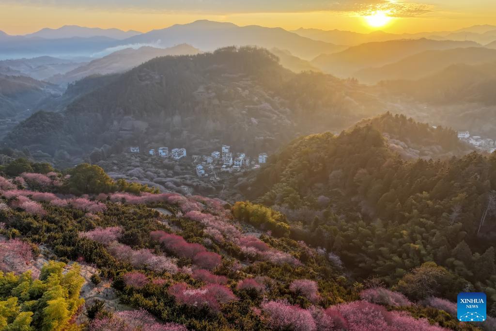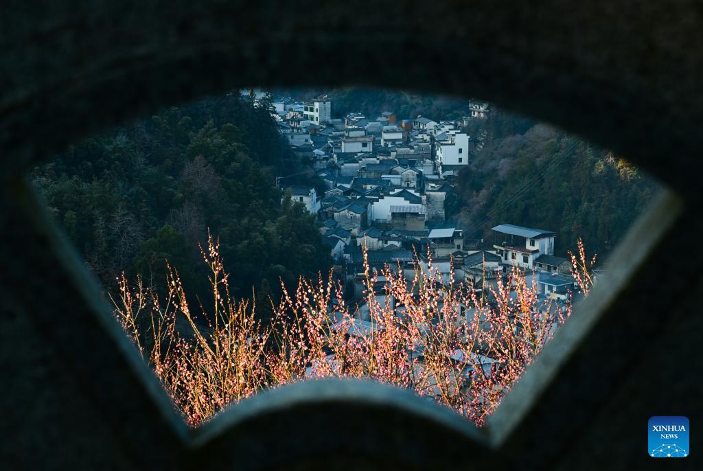 This photo taken on Feb. 9, 2026 shows the scenery of Maihuayu Villlage amid the plum blossoms in Shexian County, east China's Anhui Province. (Xinhua/Zhou Mu)