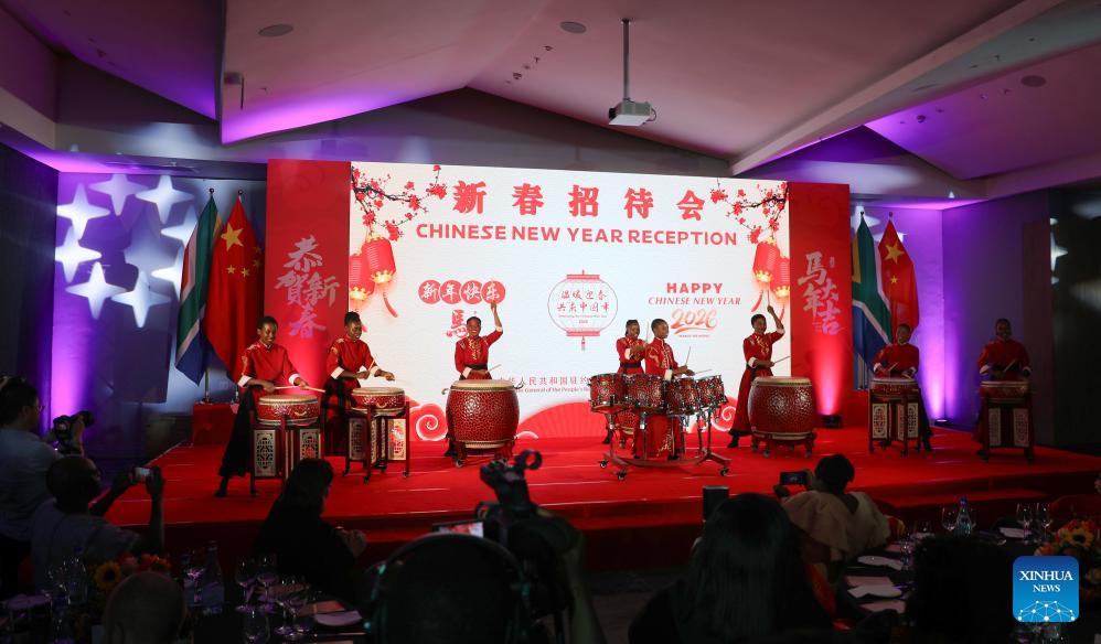 Artists perform a Chinese drum show during a reception to celebrate the upcoming Chinese New Year in Johannesburg, South Africa, Feb. 9, 2026. (Photo: Xinhua)