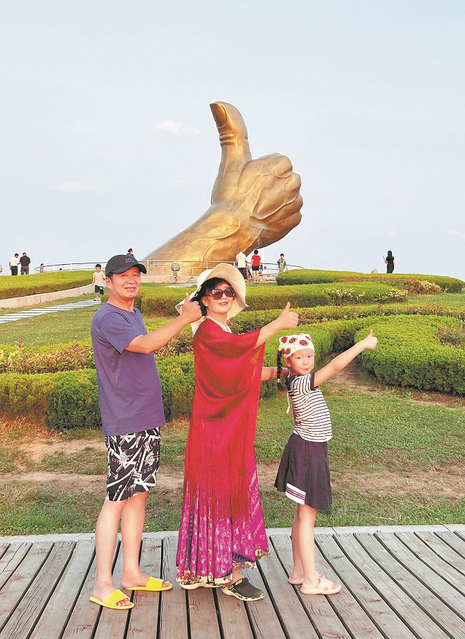 Xu Jingzhou and his wife travel with their granddaughter in Weihai, Shandong province, in 2023. (Photo provided to China Daily)