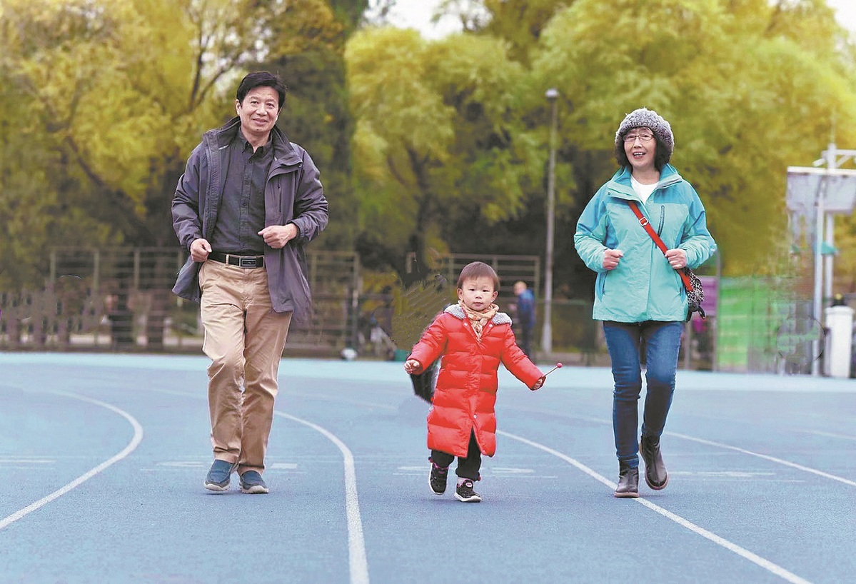 Xu and his wife do exercises with their granddaughter in Tsinghua University in Beijing in 2019. (Photo provided to China Daily)