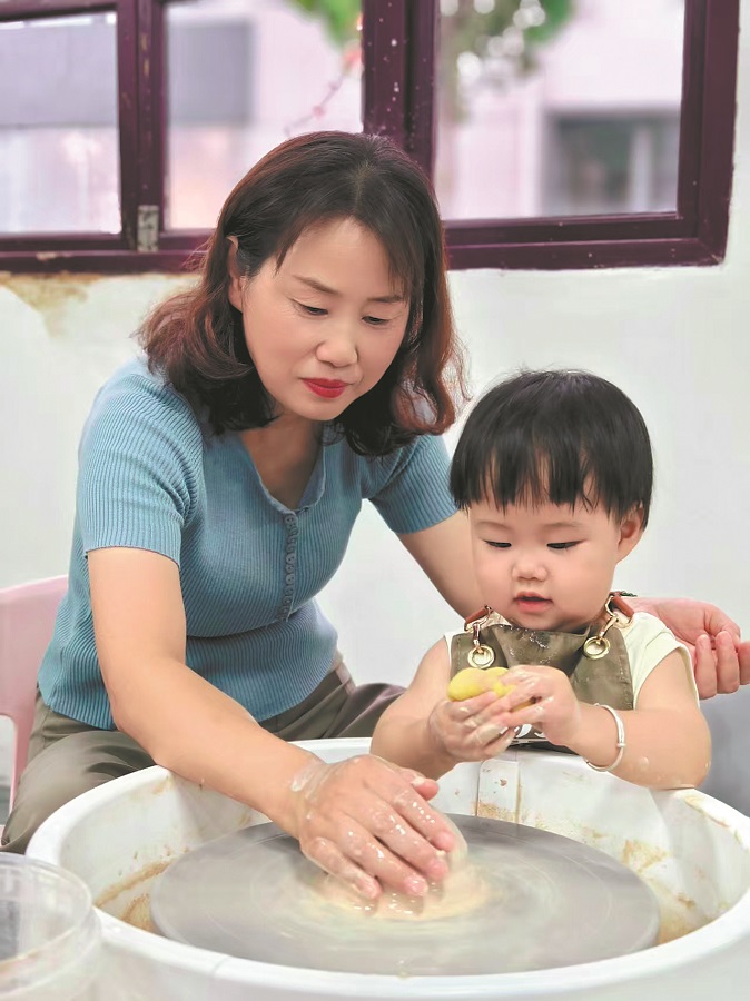 Fang Mozhi takes her granddaughter to experience pottery-making in Yixing, Jiangsu province, in August. (Photo provided to China Daily)