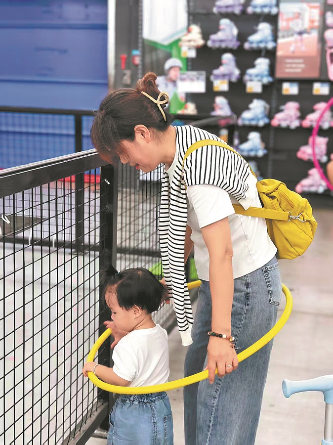 Fang plays with her granddaughter at a Decathlon store in Shanghai in July. (Photo provided to China Daily)
