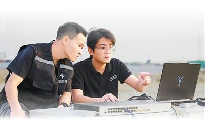 Sun Jinggui (R), a drone swarm flight planner at CroStars Technology Group, tests a drone with his colleague. (Photo: Wang Peng)