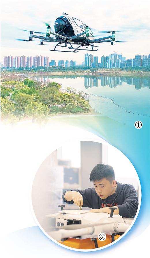 1: An aerial vehicle of EHang Intelligent Technology Co., Ltd. flies in Huangpu district, Guangzhou, south China's Guangdong Province. (Photo courtesy of EHang Intelligent Technology Co., Ltd.) 2: Chen Jinhang, a young drone operations engineer at Hangzhou Antwork Network Technology Co., Ltd., repairs a drone in Hangzhou, east China's Zhejiang Province. (Photo: Wang Yang)