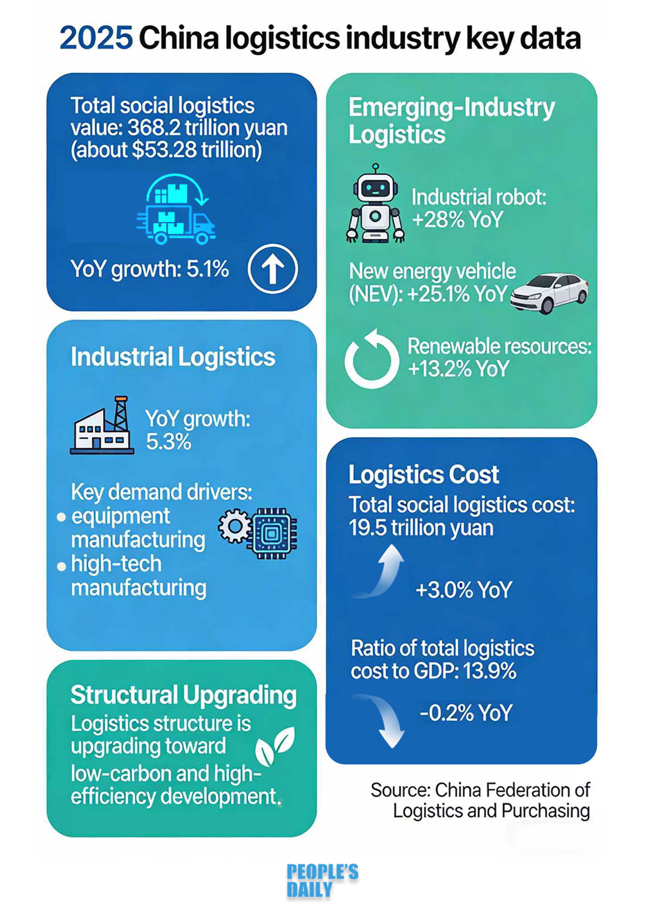 According to data released by the China Federation of Logistics and Purchasing on February 10, China's logistics sector saw steady demand growth, structural optimization, and improved efficiency in 2025, further solidifying its role in supporting economic development. (Produced by Shan Xin and Chu Chu)