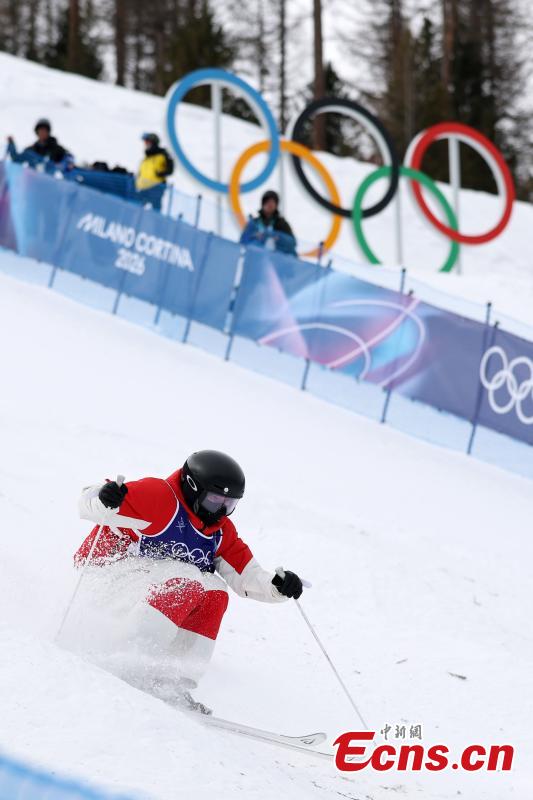Yang Ya of China is in action at the first round of the women's moguls qualification in freestyle skiing at the Milano-Cortina 2026 Winter Olympics in Livigno, Italy, Feb. 10, 2026. Yang finished 24th with a score of 57.60 points. (Photo: China News Service/Fu Tian)