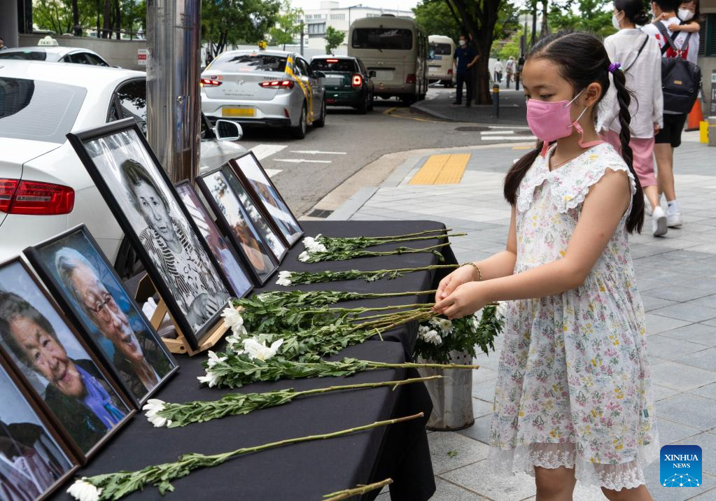 A child presents flowers to portraits of "comfort women" in Seoul, South Korea, Aug. 14, 2022. "Comfort women" refer to victims forced into sexual slavery by Japanese troops during World War II. The day of Aug. 14 was designated the International Memorial Day for "Comfort Women" in 2012 by the 11th Asian Alliance Conference for "Comfort Women." (Photo: Xinhua)