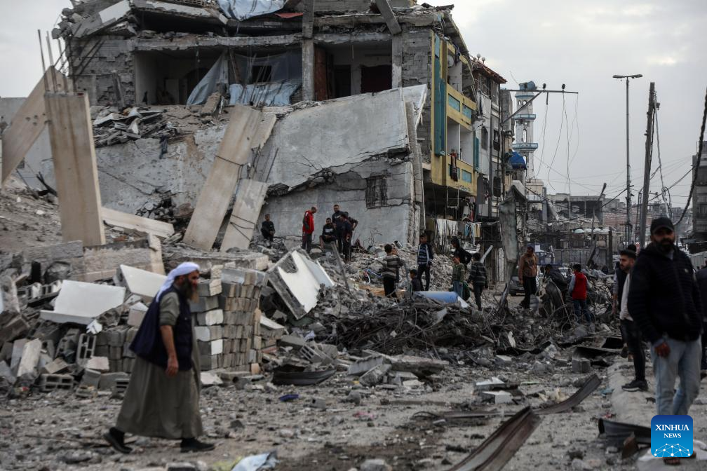 Palestinians inspect the damage after an Israeli airstrike that destroyed a three-story building in the Zeitoun neighborhood, southeast of Gaza City, on Feb. 6, 2026. (Photo: Xinhua)