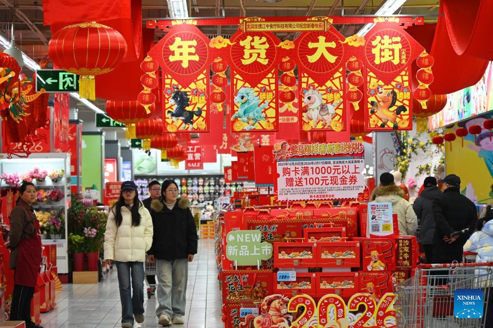 People shop for goods needed for the Chinese New Year celebrations at a market in Kaifeng, central China's Henan Province, Feb. 11, 2026. Markets across the country are bustling nowadays as people flock there to stock up on goods in preparation for the upcoming Spring Festival, or the Chinese New Year. (Photo by Li Junsheng/Xinhua)