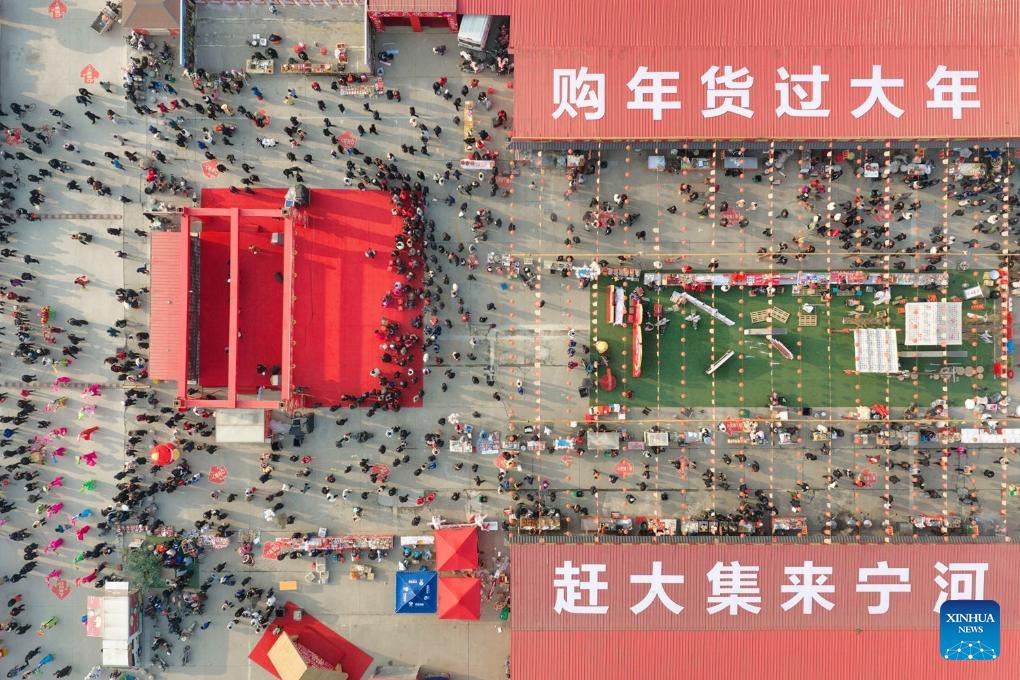 This aerial drone photo shows people purchasing goods needed for the Chinese New Year celebrations at a market in Yinji Township of Huai'an City, east China's Jiangsu Province, Feb. 13, 2026. Markets across the country are bustling nowadays as people flock there to stock up on goods in preparation for the upcoming Spring Festival, or the Chinese New Year. (Photo by Yang Yugang/Xinhua)