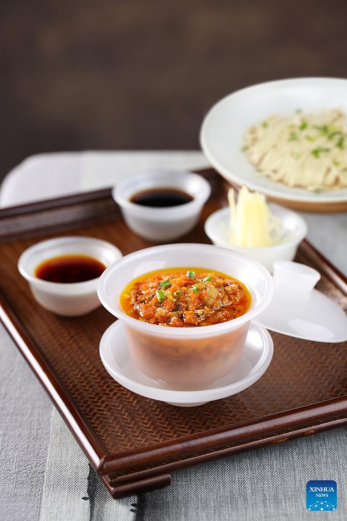 This photo taken on Feb. 13, 2026 shows a crab roe noodles set at a restaurant of Songhelou Suzhou Noodles in Shanghai, east China. (Xinhua)