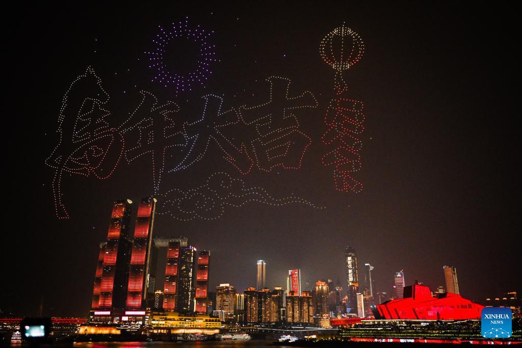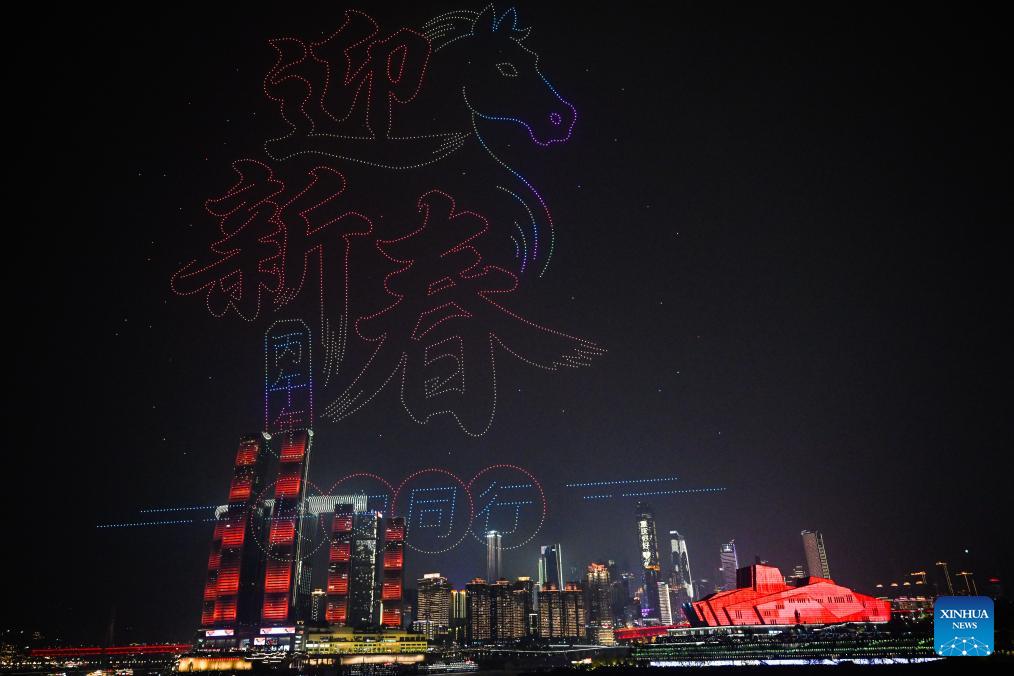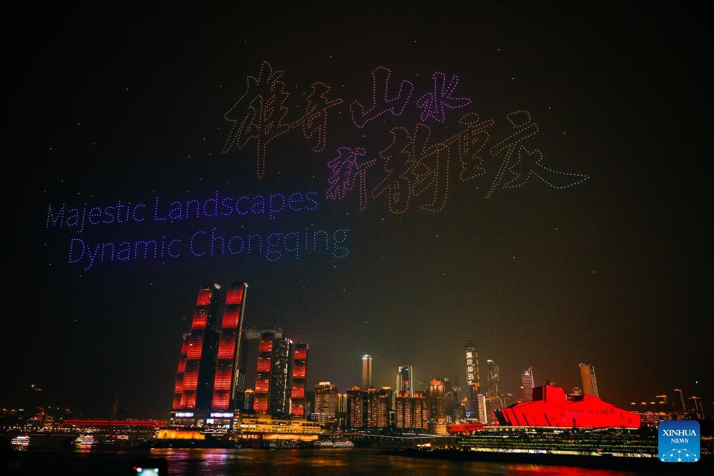 A drone light show themed "Majestic Landscapes, Dynamic Chongqing" is staged in southwest China's Chongqing Municipality, Feb. 17, 2026. (Xinhua/Wang Quanchao)