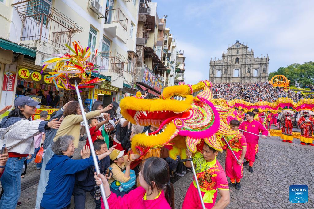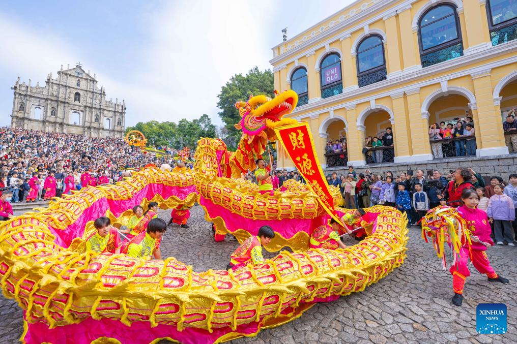 Dragon dancers perform during a celebration of the Spring Festival in front of the Ruins of St. Paul's in south China's Macao, Feb. 18, 2026. (Xinhua/Cheong Kam Ka)
