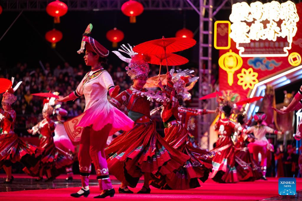 People perform during a parade in celebration of the Chinese New Year in Macao, south China, Feb. 19, 2026. A parade was held Thursday by the Macao Government Tourism Office to celebrate the Chinese New Year, or the Spring Festival. (Xinhua/Cheong Kam Ka)