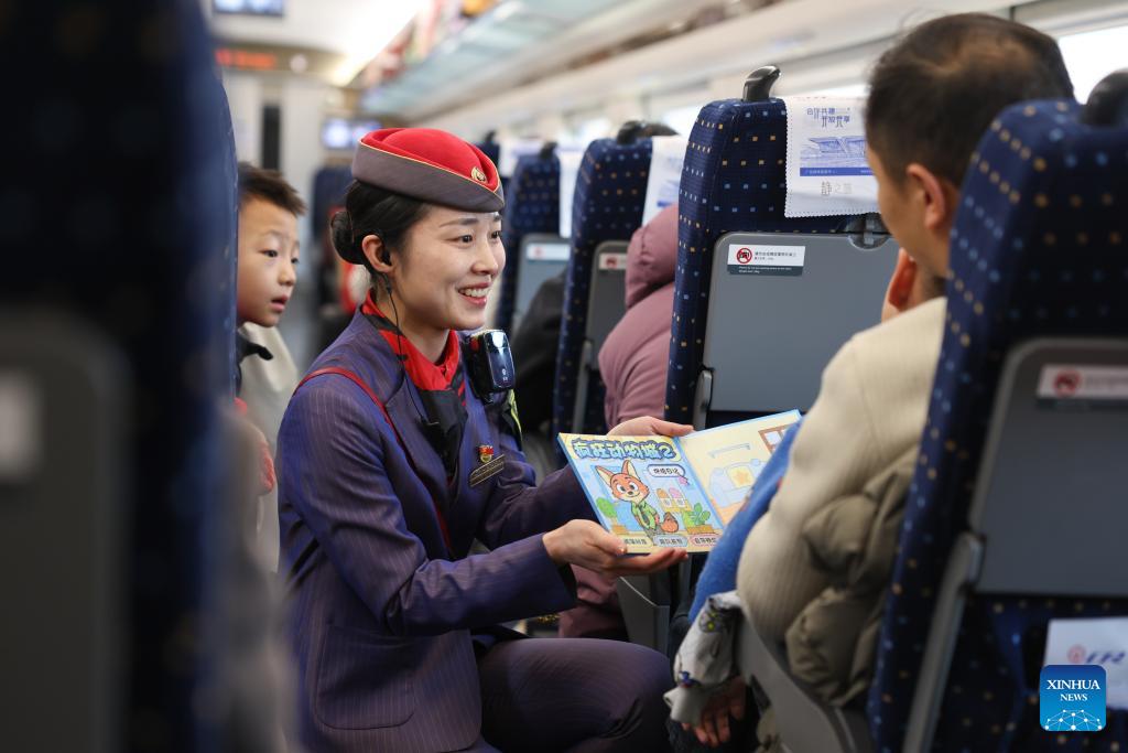 A staff member comforts a child inside a quiet carriage of train D2719 travelling from Xi'an of northwest China's Shaanxi Province to Wuwei of northwest China's Gansu Province, Feb. 18, 2026. During the Spring Festival travel season, civil aviation, railway, and other departments have increased transportation capacity and optimized convenient services such as air-rail intermodal transport, quiet carriages, luggage delivery, and priority channels for vulnerable groups, taking multiple measures to ensure passengers' safe and smooth travel. (Photo by Liu Xiang/Xinhua)