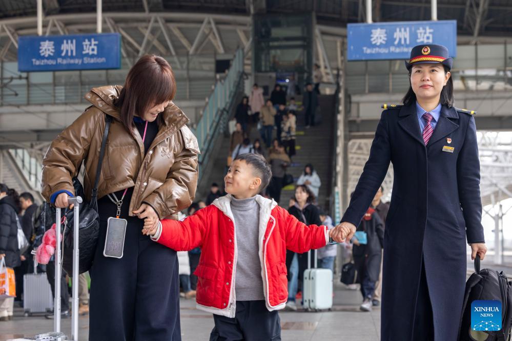 A staff member helps passengers board a train at Taizhou Railway Station in Taizhou City, east China's Jiangsu Province, Feb. 19, 2026. During the Spring Festival travel season, civil aviation, railway, and other departments have increased transportation capacity and optimized convenient services such as air-rail intermodal transport, quiet carriages, luggage delivery, and priority channels for vulnerable groups, taking multiple measures to ensure passengers' safe and smooth travel. (Photo by Tang Dehong/Xinhua)